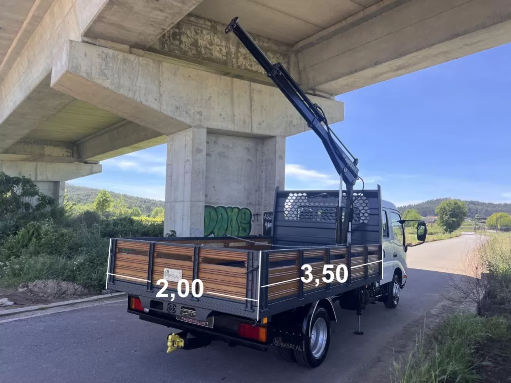 - Equipada com caixa de carga nova com fundo anti-derrapante e taipais em madeira exótica com 3,50x2,00m e Grua HIAB 017T com capacidade máxima de elevação de 1320kg a 1,25m e 385 kg a 4,20m